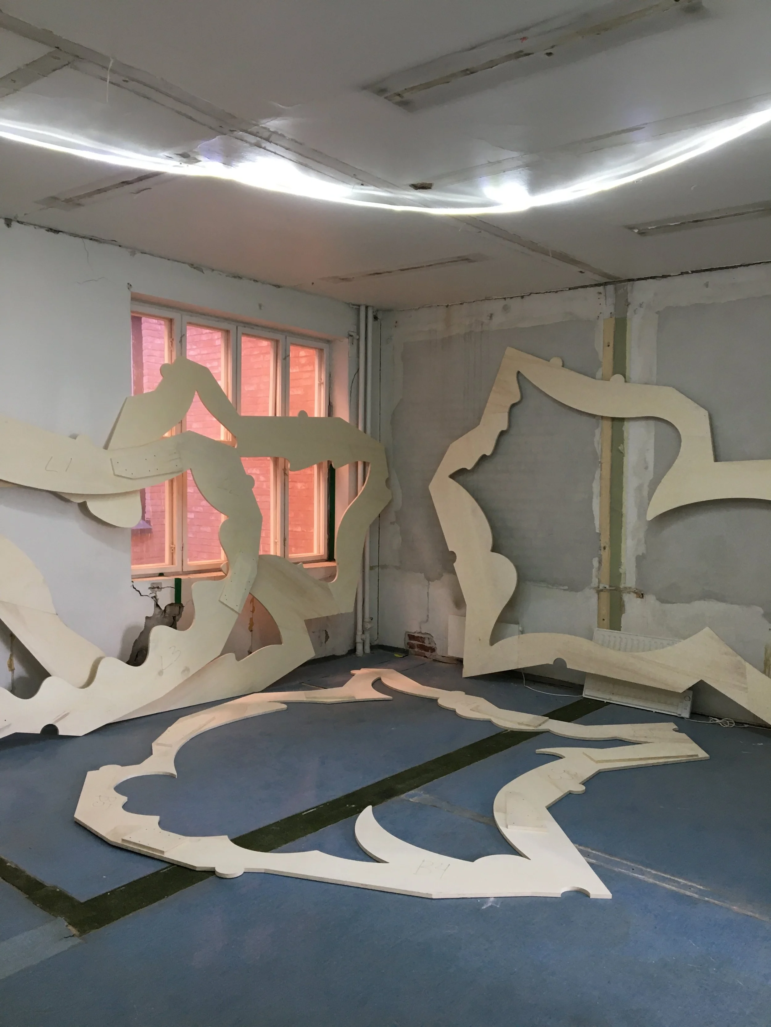 After I produced a 1:1 sized template in plywood, the wall was executed by Haandverkene A/S. Great council was given by Murbyen Oslo, Fellesverkstedet and Betongstudio A/S.