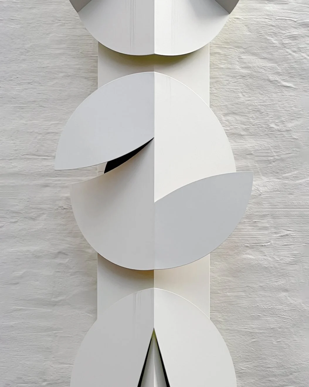 Each disk is unique in its cutting and folding of the circular shape, which is white on the front, and intermittently yellow or orange on the back. The cuts and folds allow for the color of the back to become visible on the front, indirectly, by diffusion.
