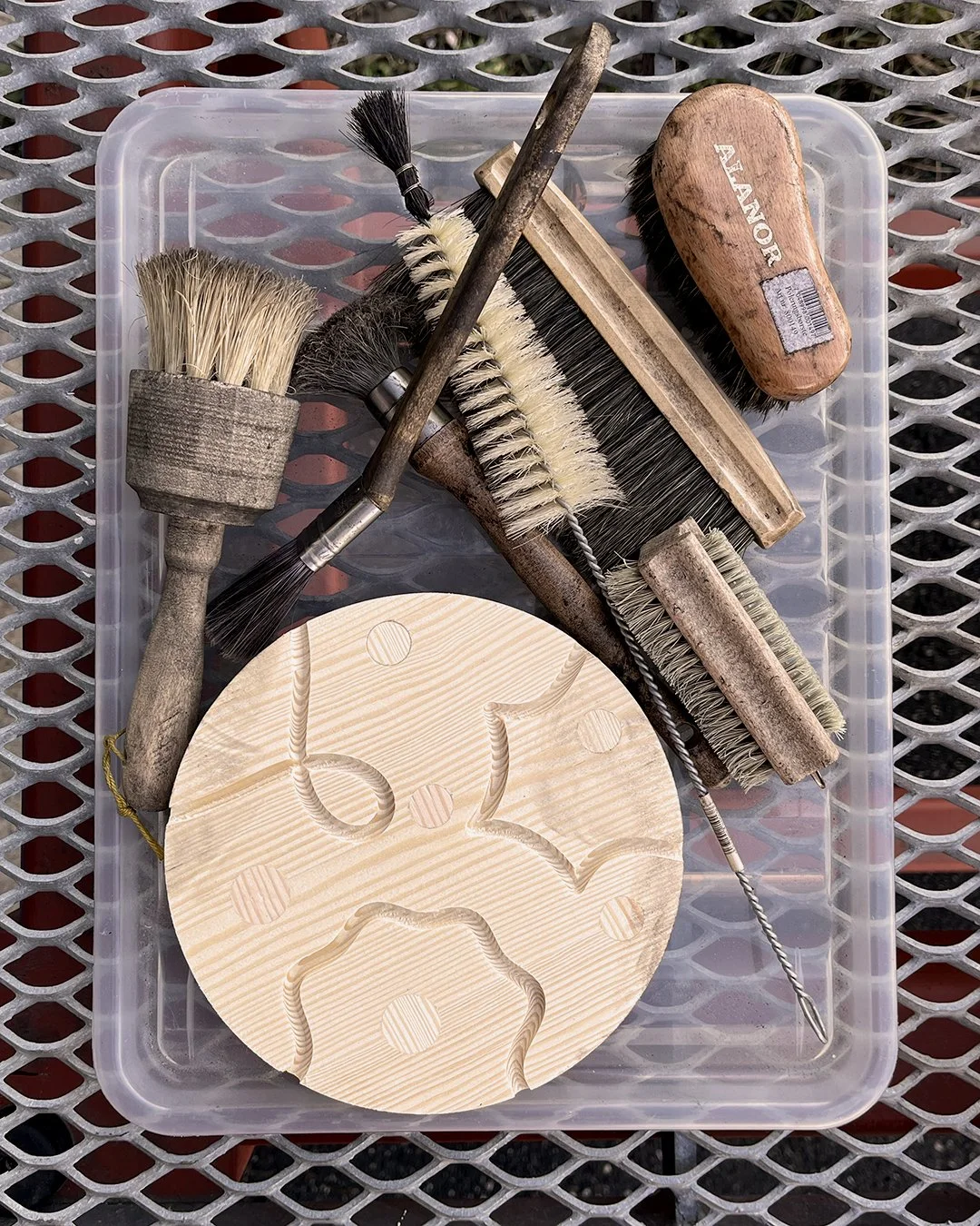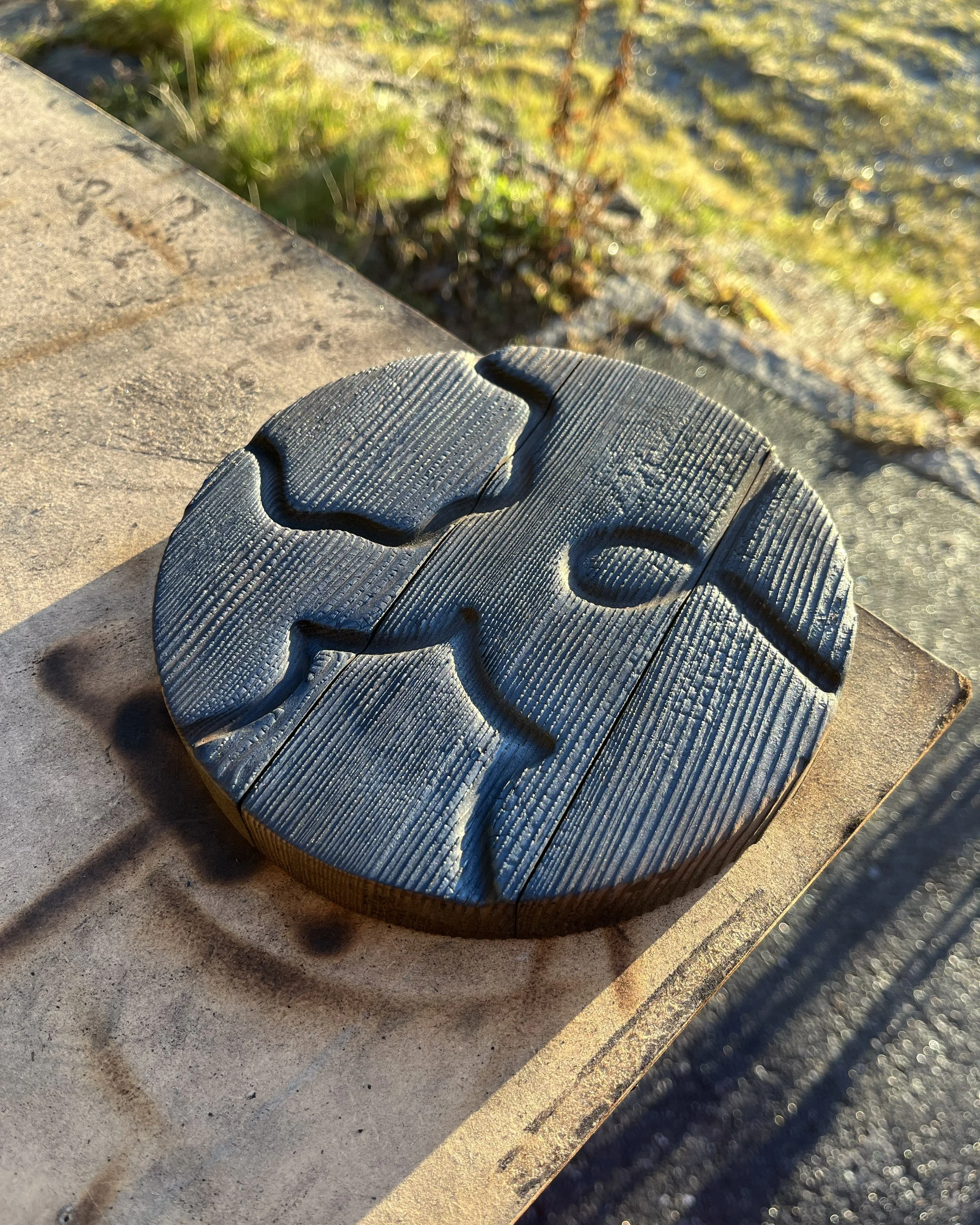 The grain of the wood is made visible and tangible by the burning process, blending in with the carved lines.