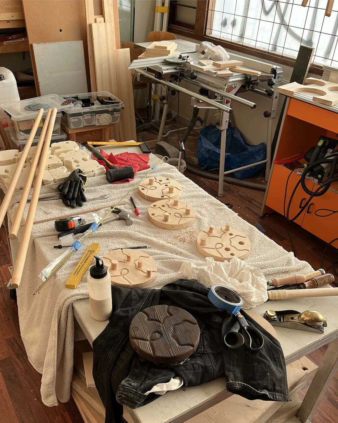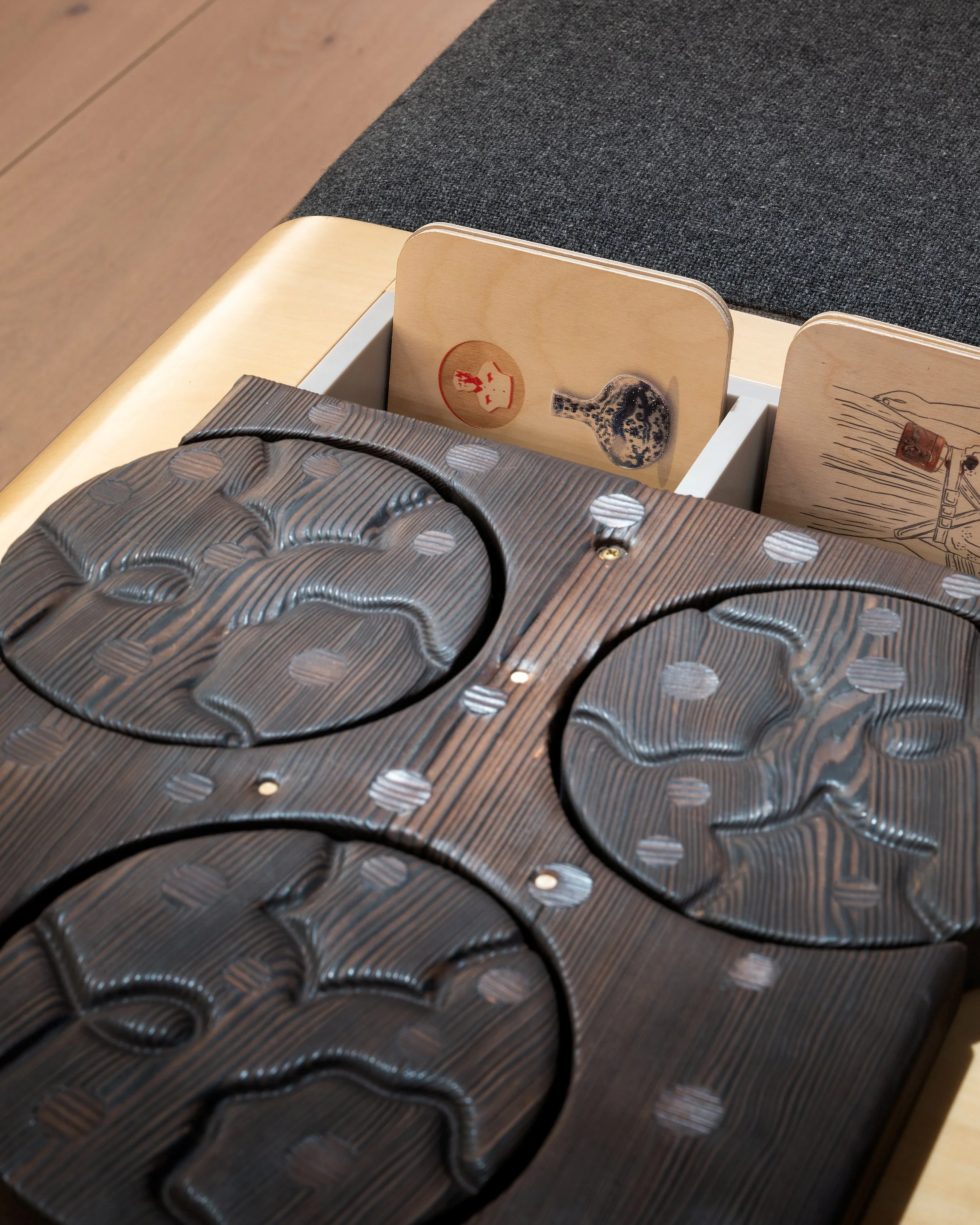 In 2025 I was asked to design new objects for two different rooms: kinetic and tactile, yet without any loose parts. I ended up making two objects which presents various ways of organizing rotating objects, geared towards visual matching - such as completing flowing lines and circles or pairing symmetrical shapes.